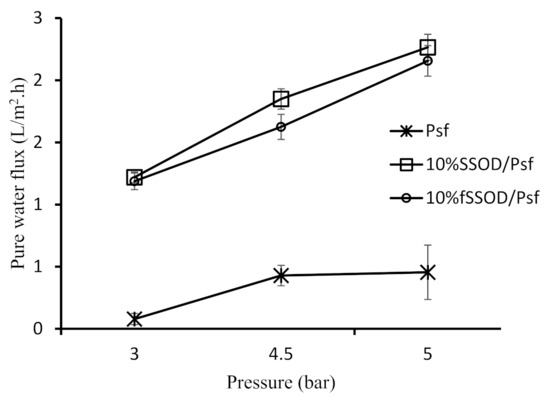 The synthesized SSOD and fSSOD nanoparticles were infused into Psf to obtain 10% SSOD/Psf membrane and 10% fSSOD/Psf membrane. First, their separation performance was compared through pure water permeation at varying membrane pressures and then in the treatment of AMD. Figure 10 depicts the pure water permeation behaviour of these membranes while Figure 11 shows their performance during the treatment of AMD. A general trend of increasing pure water flux at increasing pressure was observed for all the membranes (see Figure 10). This can be attributed to the increased driving force that facilitated the enhancement of the capillary pressure of the membrane resulting in enhanced water permeation through the membranes [38]. The infusion of nanoparticles has improved the permeability of the membranes. Consequently, a maximum membrane flux of 2.2 L/m2·h for 10% fSSOD/Psf membrane and 2.3 L/m2·h for 10% SSOD/Psf membrane was at 5 bar. This behaviour could be attributed to the presence of nanoparticles within the membrane, and the opening of the fractional free volume of the membrane at increasing transmembrane pressure [42]. Functionalizing the SSOD nanoparticles to fSSOD had negligence effect on the membrane permeability. In a study conducted by Rameetse et al. (2020), the functionalization process resulted in an improved permeability. This was attributed to hydrogen bonding between water molecules influenced by oxygen elements from the added functional groups, thus forming a thin hydration layer on the membrane surface. It is likely that the small amounts of functional groups do not have a noticeable effect, hence an increase in the time of functionalisation to increase the number of functional groups is recommended.