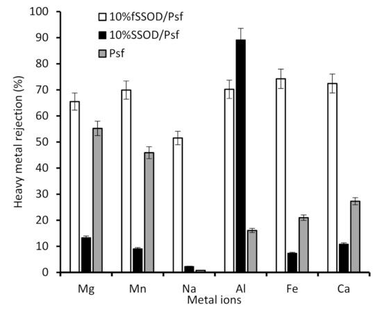 Although the SSOD-loaded membrane showed high pure water flux, a poor selectivity can be observed for the 10% SSOD/Psf membrane in Figure 11. This trade-off between selectivity and permeability of the membrane can be attributed to the poor dispersion of nanoparticles resulting in the formation of agglomerates. The agglomerates result in increased macro voids, hence, allowing large heavy metals to pass through [38]. Functionalisation of SSOD resulted in enhanced rejection in the range of 51.5–74.2%. The general observed rejection trend is Fe3+ > Ca2+ >Al3+ >Mn2+ >Mg2+ > Na2+. The improved rejection can be attributed to the successful functionalization. Pure Psf membrane showed 55.2% and 49.5% rejection for mg2+ and mn2+, respectively, when compared to the 10% SSOD-loaded membrane having 13.3% and 9.1% for mg2+ and mn2+ rejections, respectively. The improved rejection performance of the pure psf membrane could be attributed to its hydrophobic nature resulting in the membrane having lower flux compared to the SSOD loaded membranes (see Figure 10). The higher flux exhibited by 10% SSOD might have contributed to its poor rejection performance. Moreover, the concentrations of mg2+ and mn2+ metals cations are lower compared to other metals as shown in Table 1. This could also be responsible for their rejection by the pure Psf membrane.