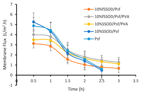 The reduction of membrane performance due to fouling is one of the challenges in membrane applications. Figure 12 shows the membranes flux over a period of time. A reduction in flux can be observed for all the evaluated membranes. The 10% SSOD/Psf membrane displayed the highest reduction of about 90.8% in membrane flux while the PVA-coated membrane displayed about 68.2% reduction in membrane flux when both membranes were evaluated under similar conditions. The drastic flux reduction in the 10% SSOD/Psf membrane (90.8%) and that of the Psf membrane (87.8%) can be attributed to the hydrophobic nature of the two membranes. Fouling is more pronounced on hydrophobic membranes as the hydrophobic foulants molecules are mostly driven to the membrane surface [43,44]. The 10% fSSOD/Psf membrane shows an improved fouling resistance when compared to that of the 10% SSOD/Psf membrane. This is likely due to the improved dispersion of nanoparticles due to functionalization; hence, most of the membrane surface had the active nanoparticles. The reduction in membrane flux of the PVA-coated membrane when compared to that of the non-PVA-coated membrane could be attributed to the increase in membrane thickness due to the coating. However, the PVA-coated membranes showed a higher fouling resistance when compared to that of the non-PVA-coated membranes.