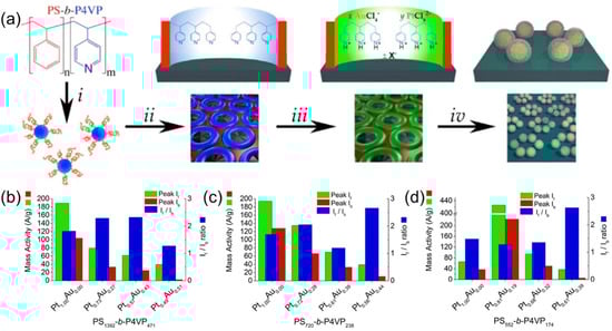 (a) Schematics of synthetic procedure for the synthesis of PtAu bimetallic, core-shell catalysts, using thin films of PS–b–P4VP micelles. (i) Solution self-assembly of PS–b–P4VP into spherical micelles in toluene; (ii) spin-coating micelles onto an electrode substrate, followed by thin film reconstruction into an array of open micelles by soaking in methanol; (iii) simultaneous loading of K2PtCl6 and KAuCl4 metal precursors into micellar array by immersion into a stoichiometrically tuned, aqueous solution of the respective metal ions; (iv) removal of PS–b–P4VP template by reductive Ar plasma etching. (b–d) Electrocatalytic activity charts for peak mass activity, If and Ib, and If/Ib ratio observed during 50 cycles of methanol oxidation for PtAu core-shell NPs, with varied Pt/Au ratios created from PS1392–b–P4VP471 (b), PS720–b–P4VP238, (c) and PS552–b–P4VP174 (d). Subscripts in BCP assignments indicate the average number of PS and P4VP units in BCP composition, whereas If and Ib denote the forward and reverse anodic peak current, respectively, derived from cyclic voltammetry experiments for methanol oxidation. Adapted from [25].