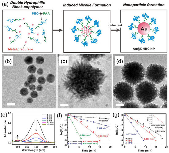 Seo et al. also demonstrated a simple approach for synthesizing Au NPs using a double-hydrophilic block copolymer (DHBC) PEO–b–PAA as a soft template [28]. Specifically, partially deprotonated, water-soluble PEO–b–PAA formed micelles upon the addition of an Au precursor, HAuCl4·3H2O, which was further converted to AuNPs with the addition of a reducing agent, as schematically shown in Figure 7a. The synthesized DHBC-stabilized Au NPs (Au–DHBC), which appeared in the form of single spherical particles per micelle (Figure 7b), were further used as catalyst for the reduction of 4-nitrophenol. Authors have reported that an AuNP catalyst with the DHBC shell displays a superior catalytic activity in the reduction of 4-nitrophenol compared to Au NPs prepared by citrate reduction, with a similar diameter of AuNPs. Authors demonstrated the versatility of the DHBC-based approach to synthesizing other metal NPs, such as Pd and Pt. Interestingly, the morphology of synthesized Pt–DHBC (Figure 7c) and Pd–DHBC (Figure 7d) was significantly different from the spherical Au–DHBC, though the identical synthetic protocol as described for Au–DHBC was used. The synthesized Au–DHBC was further used to investigate its potential as a catalyst for the reduction of 4-nitrophenol (Figure 7e), where the effect of the catalyst and NaBH4 concentrations and the effect of temperature were studied (Figure 7f,g). It was also shown that the Au–DHBC catalyst displays a superior catalytic activity in the reduction of 4-nitrophenol compared to Au NPs prepared by citrate reduction with a similar particle diameter.