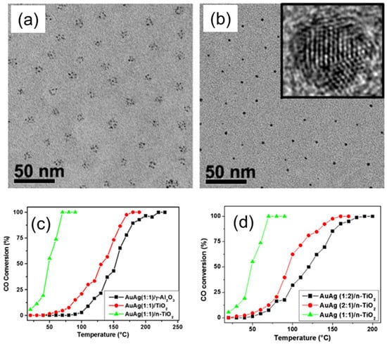 (a,b) TEM images of the bimetallic AuAg NPs (a) before and (b) after reduction. The inset shows an HRTEM image obtained for one single NP in (b). (c,d) Catalytic activity of AuAg bimetallic NPs with 1:1 (c) and 1:2 (d) Au/Ag atomic ratios, deposited on γ-Al2O3 (black), regular TiO2 (red), and BCP templates derived nanostructured n–TiO2 during catalytic CO oxidation measured at different temperatures. Reproduced from [29].