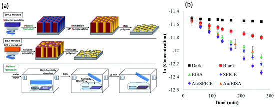 Mayeda et al. reported another BCP templating method, i.e., spin-coat pattern–immerse complex etch (SPICE), to produce thin films of well-ordered arrays of metal oxides (MgO, Al2O3, TiO2, Fe2O3, NiO, etc.) by decoupling metal oxide precursor incorporation from the BCP template, which was otherwise difficult to achieve via the evaporation-induced self-assembly (EISA)/dip-coating approach [30]. Here, perpendicularly oriented and hexagonally packed domains of PEO cylinders in PS–b–PEO films were obtained by toluene vapor annealing in a high humidity chamber, as schematically depicted in Figure 9. Subsequently, the templates were immersed in a metal precursor solution, which formed metal–polymer complexes in one polymer domain. Eventually, the organic part was removed in an oxidative environment to leave the templated metal oxides. The SPICE approach was further used to produce ordered TiO2 and Au/TiO2 arrays, which were subsequently used for the photocatalytic activity to investigate their potential as a catalyst for the degradation of methylene blue (MB). It was found that SPICE–TIO2 exhibited a 13% increase in the photocatalytic activity over EISA–TiO2. The addition of Au NPs to the SPICE–TiO2 samples (Au/TiO2) further enhanced the photocatalytic activity by 43%; however, Au NPs did not improve the catalytic activity of the EISA–TiO2.