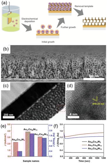 Nugraha et al. demonstrated the fabrication of a trimetallic, mesoporous electrocatalyst composed of Au, Cu, and Ni using PS–b–PEO BCP micelle multilayers as a template, as shown in Figure 10a–d [3]. The approach involves the co-electrodeposition process of Cu, Ni, and Au precursors pre-loaded into polymeric micelles acting as a sacrificial template. This approach enables accurate control over the dimensional properties and the final film composition by tuning the parameters, such as size of the micelles, electrodeposition time, or metal precursor concentration. Obtained mesoporous structures represent the negative replica of the spherical, multilayer micelle assembles, which remain unaffected upon the removal of P–-b–PEO BCP template by solvent extraction using THF. The obtained mesoporous AuCuNi imparted high electrocatalytic activity and stability for methanol oxidation in the alkaline medium (Figure 10e–f).