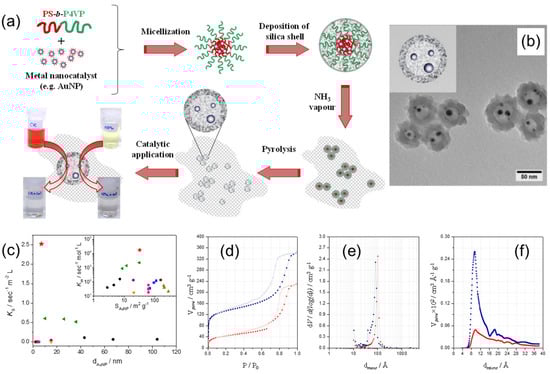Shajkumar et al. reported an interesting approach to prepare an Au–SiO2 yolk-shell catalyst embedded in porous silica support (PSS) [32]. Authors used solvent-induced co-assembly process of PS–b–P4VP BCP and polymer-stabilized Au nano-catalyst to obtain Au–PS–b–P4VP hybrid micelles, followed by a two-step sol gel process to deposit an SiO2 shell and generate a PSS matrix, as schematically shown in Figure 11a. The PS–b–P4VP BCP directed the structure of the yolk-shell nanoparticles, consisting of Au cores enclosed within the void surrounded by porous silica shell (Figure 11b). The PS core assisted the encapsulation of pre-synthesized AuNP, whereas the protonated P4VP corona helped in the formation of the silica shell. In addition, BCP micelles served as an effective porogen during its removal on pyrolysis. The Au–hollow-SiO2–PSS catalyst revealed superior catalytic activity for the catalytic reduction of 4-nitrophenol compared to analogous catalytic systems (Figure 11c) and also good performance in the catalytic degradation of Congo Red dye. The N2 adsorption–desorption isotherms of PSS-embedded Au–PS–b–P4VP–SiO2 core-shell and Au–hollow-SiO2 yolk-shell particles, as well as the corresponding size distributions of mesopores and micropores, are shown in Figure 11d–f. After calcination, the surface area increased from 150 to 430 m2g−1 (or 287%) because of the formation of micropores in the SiO2 shell upon removal of the BCP template (Figure 11f).
