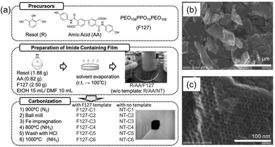 (a) Block copolymer-templated carbonization of a nitrogen–containing polymer to create mesoporous carbon for oxygen reduction catalyst. (b,c) SEM images of F127-C6 mesoporous carbon, taken at different magnifications. Adapted from [33].