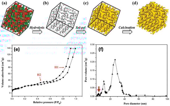 (a–d) Schematic illustration for the creation of well-defined, bicontinuous TiO2 from the templating of BCP: (a) PS–PLLA gyroid morphology (skeleton of double gyroid structure with two identical networks (green and red)); (b) gyroid-forming, mesoporous PS template after removal of minority PLLA networks. (c) PS/TiO2 gyroid nanohybrids via templated sol-gel reaction; (d) bicontinuous TiO2 with crystalline phase after removal of PS template through calcination. (e) N2 adsorption−desorption isotherm with hysteresis loops, indicating the mesoporous property of the bicontinuous TiO2. (f) Pore size distribution of the bicontinuous TiO2, calculated from the adsorption branch using the BJH method. Two major pore distributions with maxima around 11 and 24 nm pore size can be identified. Adapted from [44].