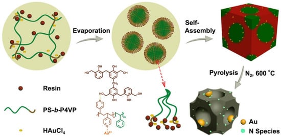 Li et al. developed another approach that combines a self-assembled PS–b–P4VP template coordinated with Au ions and a phenolic resin, in order to synthesize N-modified Au nanoparticles in an ordered, mesoporous carbon matrix [46]. The scheme of this approach is shown in Figure 16. These nanostructures were synthesized by taking the advantage of the following factors: (1) the bond between the pyridine group with Au precursor; (2) the swelling of the P4VP segment by phenolic resin species, due to the hydrogen bonding; and, (3) the formation of monodisperse, PS–b–P4VP globular micelles via self-assembly. To obtain Au-decorated, black mesoporous carbon, an as-made sample was pyrolyzed in N2. During pyrolysis, the Au precursor was reduced to about 4 nm-sized, metallic Au NPs embedded in ordered mesoporous carbon matrix. By varying the length of the PS segment, the pore size could be tuned from 6 to 12 nm. Authors use this material as a catalyst to covert benzyl alcohol to benzoic acid, which showed good results. No loss of catalytic activity and leaching of Au nano catalyst was observed after 10 cycles.