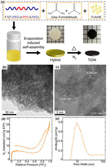 Using structure-directing BCPs, ordered mesoporous metal nitrides of targeted morphology and dimensionality could also be obtained. Recently, Li et al. presented an inexpensive method to fabricate highly ordered, crystalline, mesoporous, metal oxynitride structures that show an excellent electrochemical catalytic activity for hydrogen evolution process in KOH aqueous media [47]. The reported approach relied on a one-pot, ammonolysis-free soft templating synthesis, which was the first of its kind. In particular, the authors combined BCP-assisted self-assembly with metal sol and urea precursors to synthesize such nanostructures. A structure-directing ABA triblock copolymer (Pluronic F127), titanium-oxo-acetate sol nanoparticles (metal source), and oligomeric urea-formaldehyde (nitrogen source) were mixed to prepare hybrid monoliths by solvent evaporation-induced self-assembly. Hybrid monoliths were further pyrolyzed in a nitrogen environment to obtain crystalline, mesoporous titanium oxynitride (TiON) monoliths. A urea-formaldehyde additive was essential to provide nitrogen and support to the mesostructure upon crystallization during pyrolysis. The whole synthetic procedure is schematically shown in Figure 17a. TEM studies validated the withholding of the wormhole-like mesostructure after pyrolysis (Figure 17b). The presence of carbonaceous residue is responsible for the grainy texture of the TEM image. The lattice fringes of different crystallite orientations in the HR-TEM image (Figure 17c) confirmed the conversion of hybrids into highly crystalline, mesoporous structures. The porosity studies of the mesoporous, crystalline TiON structures revealed two sharp adsorption steps, attributed to a capillary condensation of nitrogen in the micropores and mesopores, respectively (Figure 17d,e).