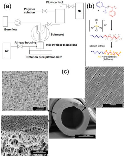 Combining the BCP self-assembly process with the dry/wet spinning technique, Hilke et al. prepared pH-responsive, PS–b–P4VP, hollow-fiber membranes with shell-side uniform pores, as schematically shown in Figure 18a [48]. The hollowness of the fibers was achieved by pushing a nonsolvent or water through the centre of the spinneret nozzle as a bore fluid. With the aid of a rotation precipitation bath, a porous, spongelike structure can be achieved from these fibers. A gold nano-catalyst was subsequently deposited onto the outer surface of hollow nanofibers, either by filtering presynthesized colloidal Au, or by reducing the Au ions after adsorption of the precursor. The single, Au-decorated hollow fiber was then tested against the catalytic reduction of 4-nitrophenol.