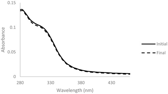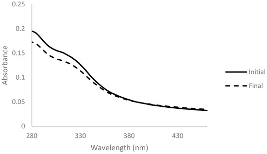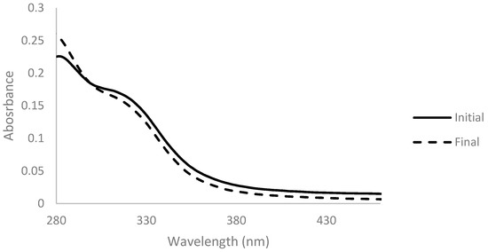 A lower absorbance of the solution in the 300-nm-onwards zone of the spectrum after reaction was noticed. This change was complemented with a change of the color of the solution, which shifted from a darker and brownish color to a lighter and yellow color (Figure 5).