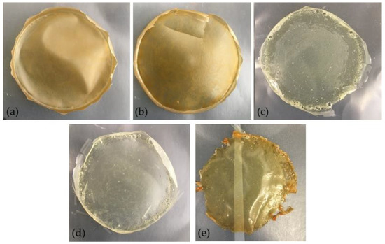 Films based on arabinoxylan (Ax): (a) 1 (Ax), (b) 2 (Ax + Glycerol), (c) 3 (Ax + Glycerol + H2O2), (d) 4 (Ax + Glycerol + H2O2 + Citric Acid), and (e) 5 (Ax + Glycerol + H2O2 + Citric Acid + 90 °C, 1 h).