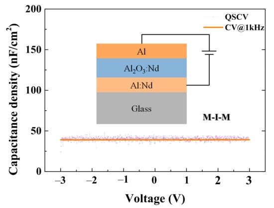 An metal-insulator-metal (M-I-M) capacitor corresponding to the NdIZO-TFT on silicon substrate was fabricated, and the measured Ci in the frequency range below 10 Hz was 42.02 ± 2.07 nF/cm2 while Ci at 1 kHz was around 39.07 nF/cm2, as shown in Figure 2. X-ray diffraction (XRD) was utilized to determine the phases of thin films using Cu Kα1 radiation (λ = 0.15418 nm). XRD measurement was performed by Empyrean Nano edition (Empyrean Nano edition, PANalytical, Almelo, The Netherlands). X-ray photoelectron spectroscopy (XPS) analysis was carried out to investigate the chemical changes in the oxide films by using a THERMO ESCALAB250Xi (Thermo Fisher Scientific, Waltham, MA, USA) with an Al Ka (hν = 1486.6 eV) 15 kW beam spot source. Microwave photoconductivity decay (μ-PCD, LTA-1620SP) was used to characterize the carrier decay characteristics of the film, and Minitab was applied to conduct data analysis and select the optimal growing conditions for the film. A semiconductor analyzer was used to characterize the electrical performance of the device. The transfer curve measured when VD = 0.1 V along with the TLM was used to evaluate the contact performance of the electrode. Through calculation, the total resistance (Rtotal) of the TFT of each channel length could be obtained. Then, taking Rtotal as the y-axis and channel length as the x-axis, the relationship between Rtotal and L was linearly fitted. The slope of the fitted line is the total channel resistance (rch), and the intersection on the y-axis is the contact resistance (RC).