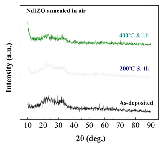 Figure 3 shows the XRD of the thicker NdIZO films (with a thickness of 40–50 nm) with increasing annealing temperature. The spectra indicate that the as-deposited films were amorphous and even remained amorphous after annealing at 400 °C for 1 h in air. Besides, two broad peaks between 20° and 35° were found due to the glass substrate [].