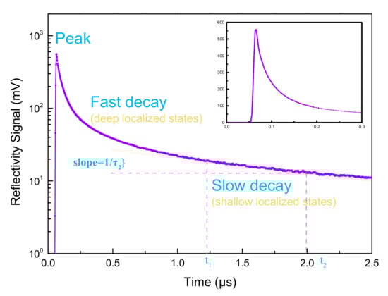 The decay curve can be divided into three components: peak value, fast decay and slow decay. The peak value, which is related to the density of the conduction band tail, originates from the recombination process of photon-generated carriers during the laser pulse irradiation. The fast decay indicates the rapid recombination of the photon-generated carriers, which is related to the recombination process through the deep localized state. The slow decay is attributed to the density of the photonic band gap state, which is assumed to be related to the trapping process of volume defects and other factors []. However, fast decay has a short lifetime and is difficult to observe directly. When the pulse width of the laser is large enough relative to the lifetime, the peak is proportional to the lifetime. Therefore, for the evaluation of deep level traps, μ-PCD uses peak values that can be measured quickly and accurately, rather than using the lifetime value of rapid decay []. So, the two characteristic parameters obtained by analyzing the μ-PCD decay curve are the peak value and τ2, where the peak value represents the number of carriers and τ2 is related to film uniformity. The slow decay τ2 corresponds to the slope between t1 and t2, as shown in Figure 4 []. The higher the peak value and the lower τ2, the better the quality of the film.