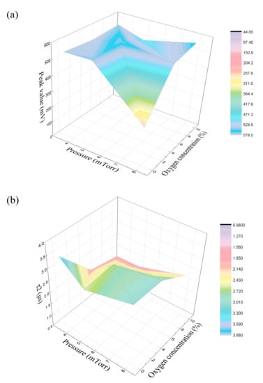 Figure 5 shows the relationship between the peak value and τ2, and oxygen concentration and sputtering pressure. From Figure 5a, it can be seen that the curved surface reaches its peak when the pressure is 3.5–5.5 mTorr and the oxygen concentration is between 4% and 8%. From Figure 5b, it can be seen that when the pressure rises from 3.38 mTorr to 8 mTorr with low oxygen concentration, τ2 decreases rapidly at first and then increases slowly, and reaches a minimum value of around 4.5 mTorr. τ2 shows a roughly increasing trend with the increase in the pressure at high oxygen concentration. With the increase in the oxygen concentration, τ2 decreases sharply at first, then tends to be flat, and then decreases slowly. This may be because when the oxygen concentration is low, with the decrease in oxygen concentration during sputtering, the concentration of carrier in the film increases due to the increase in donor-like defects. High oxygen concentration will lead to the reduction of oxygen vacancies, which mainly provide the carriers in oxide semiconductors []. This change results in a corresponding reduction in carrier concentration and τ2.