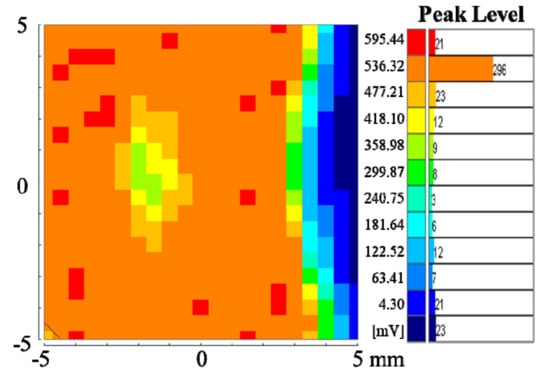 Based on the above analysis, in order to balance the peak value and τ2, the final choice for the sputtering condition of the active layer was: 5 mTorr and 5% of oxygen. The appropriate peak value was the one that would not generate excess carriers at the above condition. Figure 6 shows the μ-PCD mapping scan result with a scanning area of 0.5 * 0.5 mm for each point []. The performance of the carriers and their distribution in the film were considered to be uniform [], which is consistent with a low τ2.