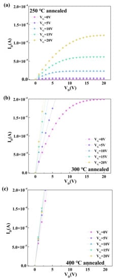 The output characteristics of the NdIZO TFTs at annealing temperatures of (a) 250 °C, (b) 300 °C, and (c) 400 °C.