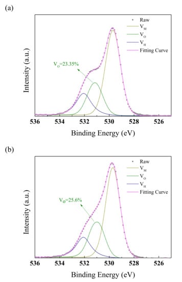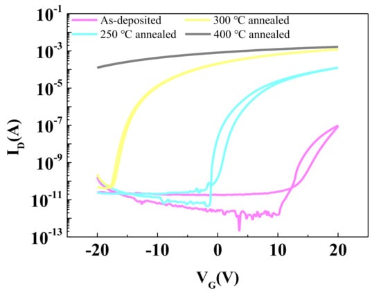 An XPS measurement was taken to test the hypothesis, as seen in Figure 9. In oxide semiconductors, oxygen vacancies will provide excess carriers that cannot be controlled by the gate voltage []. When the annealing temperature continues to rise, the excess carrier concentration gradually outnumbers the carrier concentration driven by the gate voltage in quantity, making the ID-VG image an almost horizontal line, and the device loses its switching characteristics.