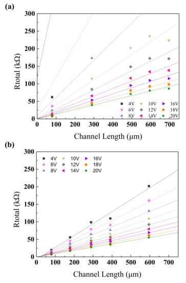 In order to further characterize the effect of the annealing temperature on the electrical properties of NdIZO-TFTs, the transmission line method (TLM) [] was used to evaluate the contact performance of the device (Equation (5)). TLM utilizes a simple series resistant model that describes channel resistance increases with increasing channel length while the contact resistance between the channel and metallization remains the same [,].
