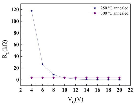 Figure 10 shows the fitting images when the annealing temperature is 250 °C and 300 °C. When the annealing temperature is 250 °C, the fitted lines do not intersect at one point, and each intercept of the ordinate represents the RC under a specific VG. However, when the annealing temperature is 300 °C, the result is just the opposite, that is, the fitted lines intersect at one point and the RC becomes a constant value.