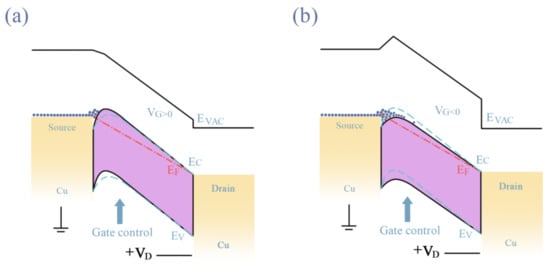 Finally, a hypothetical band diagram of the contact between the Cu S/D electrode and NdIZO semiconductor film at 250 °C and 300 °C is shown in Figure 12, based on the one proposed by Lu et al. []. Different electrical conductivity at different temperatures leads to different contact barriers. As shown in Figure 12a, at 250 °C, the carrier needs to tunnel through an additional block layer, which is equivalent to increasing the potential barrier of the conduction band. Thus, an enhanced mode with a normally closed channel was implemented, since a positive gate voltage is required to conduct the channel. As shown in Figure 12b, the end of the energy band is significantly bent with an annealing temperature of 300 °C, and a potential well will be formed through the metal–semiconductor contact effect, resulting in the failure to close at VG = 0 V. A very negative gate voltage is needed to exhaust the remaining free electrons, which is equivalent to increasing the potential barrier of the conduction band.