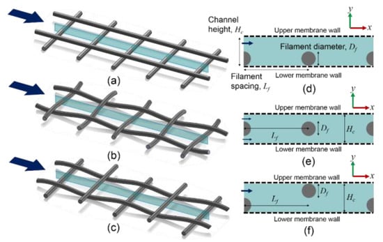 Three-dimensional spacer geometries (a–c) and their cross-sections along the main flow path (d–f). (a) Nonwoven spacer, (b) fully woven spacer, (c) partially woven spacer. 2D cross-sections: (d) cavity, (e) submerged, and (f) zigzag configuration.