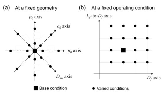 Schematic illustration of strategy for varying operating and geometric conditions. (a) at a fixed geometry (b) at a fixed operating condition.