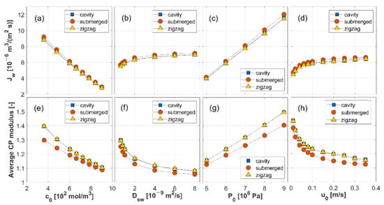 Average water fluxes (top) and CP moduli (bottom) in the cavity, submerged and zigzag configurations for varying inlet concentration c0 (a,e), diffusivity of solute in water Dsw (b,f), outlet pressure p0 (c,g), and inlet velocity u0 (d,h).