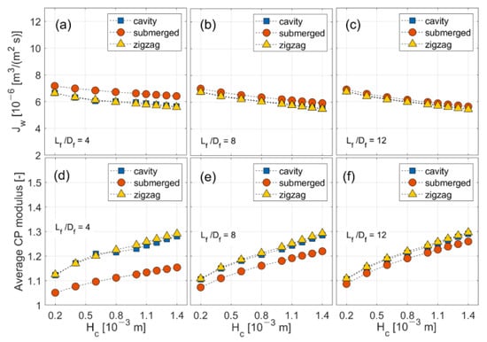 Average water fluxes (top) and CP moduli (bottom) in the cavity, submerged and zigzag configurations for varying channel height at selected filament length to diameter (Lf/Df) ratios. (a,d): Lf/Df =4; (b,e): Lf/Df =8; (c,f): Lf/Df =12.