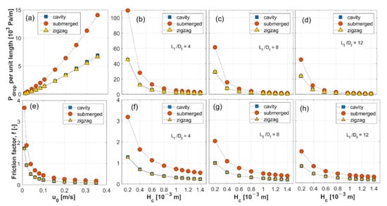 Pressure drop per unit length (top) and friction factor (bottom) in the cavity, submerged and zigzag configurations with respect to inlet velocity (a,e) and channel height with Lf/Df =4 (b,f), Lf/Df =/8 (c,g), Lf/Df =12 (d,h).