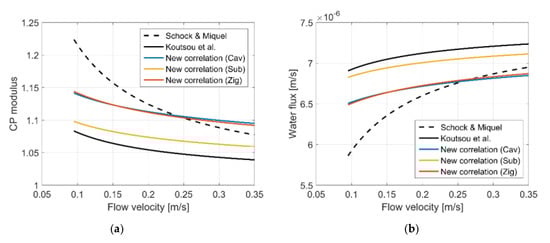 Comparisons of CP modulus and water flux calculated by different correlations: Sherwood number correlations of Schock and Miquel [] and Koutsou et al. [] expressed in Equations (20) and (21), respectively, and our new correlations. (a) CP modulus and (b) water flux.