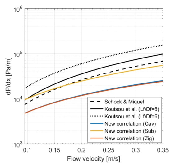 Comparison of pressure gradient calculated by different correlations: Schock and Miquel [] and Koutsout et al. [] expressed in Equations (23) and (24), respectively, and our new correlations for three spacer configurations.