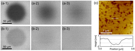 Figure 1a,b show the epi-fluorescence microscope images during the fluorescence recovery after photobleaching (FRAP) [36,37] process of PI+PC-SLB including BODIPY-HPC and DiI-C18, respectively. Homogeneous fluorescence intensity was obtained over almost the entire sample surface, and the fluorescence intensity recovered in the FRAP observation. The results in Figure 1a,b show that uniform, fluid and continuous PI+PC-SLB was formed on the mica substrate. Figure 1c shows the AFM topography (3.0 × 3.0 µm2) of the PI+PC-SLB on the mica substrate. Depression regions of approximately 1.4 ± 0.3 nm (N = 86) depth existed in the PI+PC-SLB. The depression regions were not holes in the SLB but attributed to domains in the lipid bilayer membrane with the different thickness from the surrounding region. Typical thickness of lipid bilayers in AFM topographies are 4−5 nm, and the height difference between lipid domains in SLB is observed as approximately 0.5–1.5 nm [38,39,40]. The lateral size of the depression domains was on the order of 10 nm to 100 nm. The averaged diameter was calculated as 101 ± 7.8 nm (N = 1589 from 9 images). The area fraction of the depression domains was 24 ± 2.2% (N = 9).