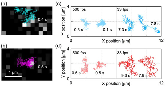 (a,b) Single molecule fluorescence images and diffusion trajectories of (a) BODIPY-HPC and (b) DiI-C18 in PI+PC-SLB obtained by SPT at the frame rate of 500 fps. (c,d) Single molecule trajectories of (c) BODIPY-HPC and (d) DiI-C18 in PI+PC-SLB. Left and right columns correspond to the trajectories obtained at 500 fps and 33 fps, respectively. The length (measurement time) of each trajectory is appended.