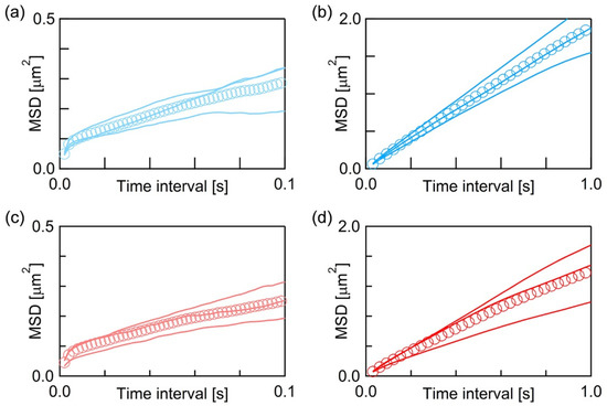 We obtained more than 103 trajectories at each acquisition rate for both fluorescence probes and calculated their average MSD (Equations (1) and (2)). Figure 3 shows the average MSD-τ plots of BODIPY-HPC at 500 fps (Figure 3a) and at 30 fps (Figure 3b), and those of DiI-C18 at 500 fps (Figure 3c) and at 30 fps (Figure 3d). In each of Figure 3a–d, three solid curves are the average MSD-τ plots obtained from three independently prepared PI+PC-SLB samples, and their overall average is plotted as markers. MSD increased with τ, but not linearly in all the average MSD-τ plots. Random diffusion, which is called normal diffusion, gives linear dependence between MSD and τ, while the diffusion in a heterogeneous medium shows non-linear MSD−τ dependence [35,48,49]. This phenomenon is categorized as anomalous diffusion, and the analysis of the spatiotemporal dependence of the diffusion behavior provides the information of inner structures and their physical properties in a heterogeneous medium. As shown in Figure 3, the average MSD−τ plots showed obvious non-linearity, thus we further investigated spatiotemporal dependence of the molecular diffusion in detail.