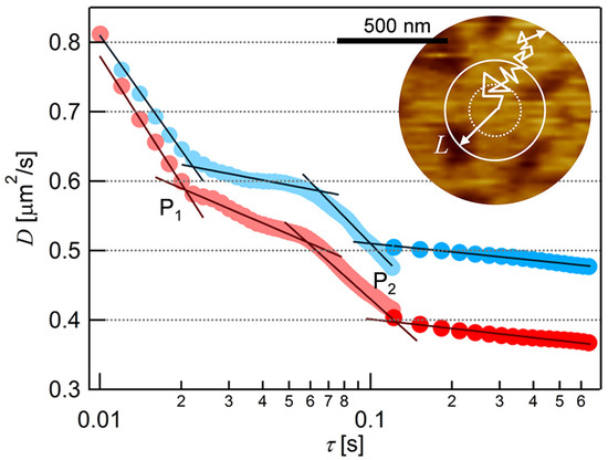 We obtained D at each τ from the average MSD-τ plots in Figure 3 and plotted them in Figure 4. In both cases of the two fluorescence probes, the value of D decreased with τ in the range of τ < 0.02, and 0.06 < τ < 0.1, and finally approached to constant at τ > 0.1. Two infection points, at which a downward slope curve turns to flat, were present in each plot at τ ~ 0.02 s and τ ~ 0.1 s (P1 and P2 in Figure 4). This is a typical behavior of the anomalous diffusion caused by the diffusion obstacles [48,49]. In the case of the PC-SLB without PI on mica, D did not depend on τ (Figure S2 in Supporting Information) because the PC-SLB is two-dimensionally homogeneous as mentioned above [32]. The trajectories obtained at 30 fps (Figure 2) show that the diffusion distances extended to several micrometers, therefore indicate the fluid region was continuous in this spatial range. We interpret the AFM topography in Figure 1c as that the microdomains worked as diffusion obstacles and that the surrounding region was fluid.