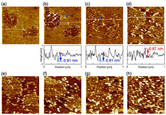 Snapshots from the sequence of AFM topographies (1.0 × 1.0 μm2) of the PI+PC-SLB (a) 203 s, (b) 376 s, (c) 897 s, (d) 1418 s, (e) 1962 s, (f) 2679 s, (g) 3753 s, and (h) 6260 s after the addition of FBP-17. The cross-section profile at the white line is accompanied in (b–d). The depression microdomains in the view filed is marked with the dashed line in (a,b). Representative protrusions in the microdomain and the surrounding region were indicated by white and blue arrows, respectively, in (b). In the cross-section profiles, the level of the surrounding region is represented by a black line with a red triangle; the level of the microdomain is represented with a blue line or a red line with a blue triangle, in case the microdomain is depressed or protruded from the surrounding region, respectively.