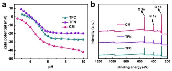 (a) Zeta potentials and (b) XPS results of the composite membranes.