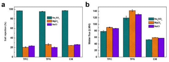 The basic nanofiltration performances of developed membranes were investigated using 1 g/L Na2SO4, MgCl2 and NaCl solutions. As shown in Figure 4a, the rejection of the TFN membrane toward Na2SO4 is comparable to those of the TFC and CM membranes, which indicates the avoidance of unselective interfacial defects thanks to the good compatibility of organic nanobowls. In comparison, the MgCl2 rejection of the TFN membrane is 5.97% and 2.16% higher than those of the TFC and CM membranes, respectively. This difference is mainly due to the weaker negative charge of the TFN membrane, which reduces the electrostatic adsorption force between the negatively charged membrane surface and positively charged salts [40]. However, it can also be observed from Figure 4a that the NaCl rejection of TFN membrane was the lowest among the three membranes. This result is explained by the largest pore size of the PA layer of TFN membrane (as demonstrated by the XPS results), which allows the facile passage of electroneutral NaCl. The water fluxes of the composite membranes are presented in Figure 4b. Obviously, owing to the better hydrophilicity (favoring the membrane wettability), rougher surface (providing more effective contact sites) and more free volumes (induced by the organic nanobowls, decreasing mass transport resistance), the TFN membrane shows the highest water flux of 119.44 ± 5.56, 141.82 ± 3.24 and 130.27 ± 2.05 (L/(m2·h)) LHM toward Na2SO4, MgCl2 and NaCl solutions, respectively, compared with the TFC and CM membranes.