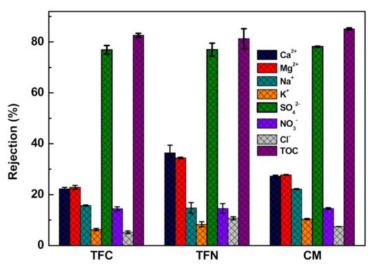 To further investigate the separation performance of the composite membranes, various water resources, e.g., seawater, tap water, municipal effluent and heavy metal wastewater, were applied. The corresponding water fluxes of TFC, TFN and CM membranes toward seawater are 69.89 ± 2.72, 102.68 ± 4.39 and 44.36 ± 1.66 LHM, respectively. Clearly, the TFN membrane presented the highest flux, which was ascribed to its elevated hydrophilicity, effective contact sites and free volumes of the selective PA layer. As shown in Figure 5 and Table S1, all composite membranes are able to effectively remove ions and organic species from seawater. Notably, the rejections of SO42− and TOC of all membranes are around 80%. However, compared with the TFC and CM membranes, the TFN membrane shows higher rejection rates for Mg2+ and Ca2+ cations. These results are induced by the dominant Donnan effect of the TFN membrane based on the absence of unselective interfacial defects [41]. The relatively lower negative charge of the TFN membrane is beneficial for weakening the electrostatic adsorption between the membrane surface and the cations, leading to elevated cation rejection. Besides, the rejection of the TFN membrane toward monovalent ions with smaller size and weaker charge property is lower than those of the TFC and CM membranes, which is due to its looser selective PA layer, reducing the mass transport resistance. In addition, the looser structure of the TFN membrane also causes the slightly decreased removal of organic species, as demonstrated by the TOC results in Table S1.