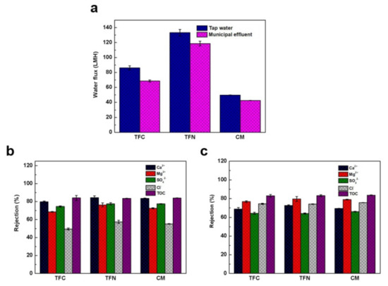 (a) Water fluxes of the composite membranes toward tap water and municipal effluent. Rejections of the composite membranes toward (b) tap water (c) municipal effluent.