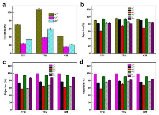 Further, the NF membranes prevailed in treating industrial wastewater including heavy metal wastewater [44,45,46,47,48]. Before separation, the pH of the heavy metal wastewater was adjusted to a suitable working condition for the NF membrane followed by pre-filtration with a microfiltration membrane. It can be seen in Figure 7a that the fluxes in all membranes are in the order of Ni2+ > Zn2+ > Cr3+. This was caused by the higher concentration of ions (Ni2 +< Zn2+ < Cr3+) (Tables S4–S6), which resulted in higher osmotic pressure across the membrane, leading to a decreased water flux. However, the fluxes in the TFN membranes are superior to the other membranes thanks to their better hydrophilicity, higher number of separation sites and free volumes, as discussed above.