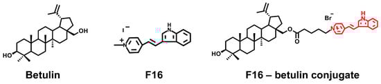 Structure of betulin, F16 ([E-4-(1H-indol-3-ylvinyl)-N-methylpyridinium iodide]) and of F16-betulin conjugate.