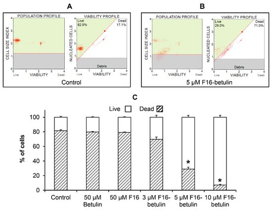 Cytotoxicity of the F16-betulin conjugate against rat thymocytes. Cell viability was assessed using a Muse Cell Analyzer. The upper left quadrant of the viability profile plots (A,B) represents healthy thymocytes, and the right quadrant shows dead ones. Typical viability profile plots are shown. A similar pattern was observed in four independent experiments. Panel (C) demonstrates the ratio (%) of living and dead thymocytes, mean values ± SEM (n = 4) are presented. * p < 0.05 (vs. control).