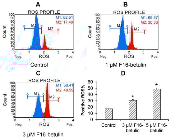 Reactive oxygen species (ROS) burst in thymocytes induced by the F16-betulin conjugate. The ROS profile was assessed using the Muse Oxidative Stress kit (superoxide sensitive). Typical ROS profile plots (A–C) are shown. A similar pattern was observed in three independent experiments. Panel (D) demonstrates the percentage of dihydroethidium-stained (ROS positive) cells (means ± SEM; n = 3). * p < 0.05 (vs. control).