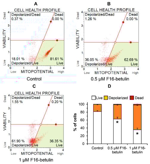 Effect of F16-betulin conjugate on mitochondrial potential of rat thymocytes. The mitochondrial potential of cells was evaluated using the Muse MitoPotential Kit. Typical mitopotential profile plots (A–C) are shown. A similar pattern was observed in three independent experiments. Panel (D) demonstrates the effect of the conjugate on the distribution of cells losing mitochondrial potential (means ± SEM, n = 3). * p < 0.05 (vs. control).