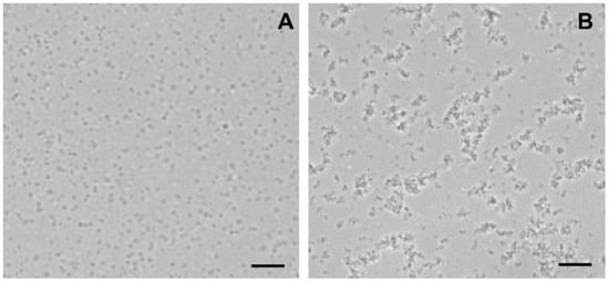 We have previously demonstrated that betulin exhibits pronounced membranotropic properties, facilitating the aggregation and permeabilization of biological membranes, including mitochondrial and artificial membranes []. One could assume that F16-betulin conjugate, possessing similar properties, will accumulate in mitochondrial membranes and affect the surface properties of organelles and their components. To test this, in the next part of the work we used mitochondria isolated from the liver of laboratory rats to evaluate the direct effect of F16-betulin on the behavior of organelles. Using optical microscopy, we studied the state of the mitochondria. In the absence of F16-betulin, mitochondrial particles show a separate location (Figure 5A). However, the addition of the conjugate to the suspension caused the formation of aggregates of mitochondrial particles (Figure 5B).