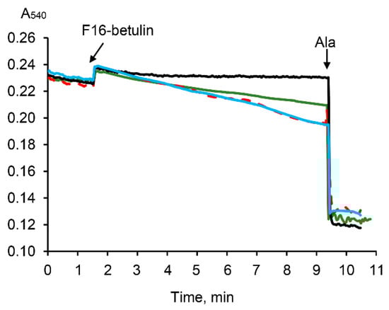 It is known that the aggregation of mitochondria and the permeabilization of their membranes can be recorded by a decrease in the optical density of the organelle suspension [,]. Indeed, Figure 6 demonstrates that F16-betulin induces a slow decrease in the optical density of the mitochondrial suspension. This picture is observed only in the presence of oxidation substrates and is most pronounced in the case of respiration of organelles driven by succinate. In addition, this process is insensitive to cyclosporin A (CsA), an inhibitor of the mitochondrial permeability transition (MPT) pore. This may reflect that F16-betulin conjugate induces CsA-insensitive aggregation and swelling of organelles due to permeabilization of the inner membrane.