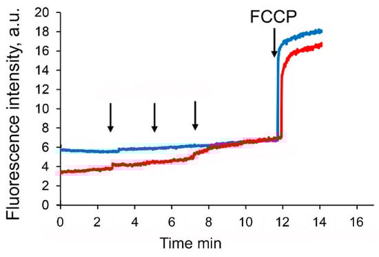 The mitochondrial Δψ was evaluated with the fluorescent probe safranine O (λex = 520 nm; λem = 580 nm) with the use of a Fluorat-02-Panorama spectrofluorimeter (Lumex Instruments, St. Petersburg, Russia) []. Rat liver mitochondria (0.5 mg/mL) were incubated in the medium containing 210 mM mannitol, 70 mM sucrose, 1 mM KH2PO4, 10 μM EGTA, 10 µM safranine O and 10 mM Hepes/KOH buffer, pH 7.4. 2.5 mM glutamate plus 2.5 mM malate or 5 mM succinate were used as respiratory substrates. In the latter case, the incubation medium was supplemented with 1 μM rotenone.